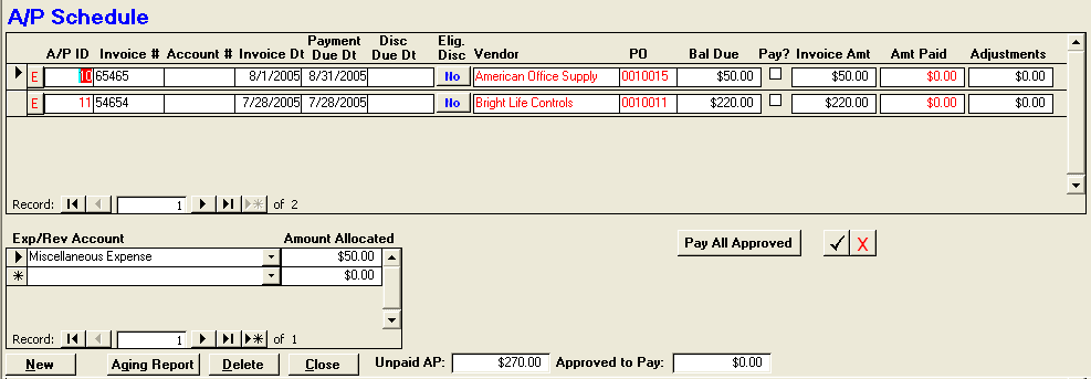 Enter or edit detailed information about your outstanding accounts payable. To make payment simply check the accounts you wish to pay and click 'Pay All Approved'.
