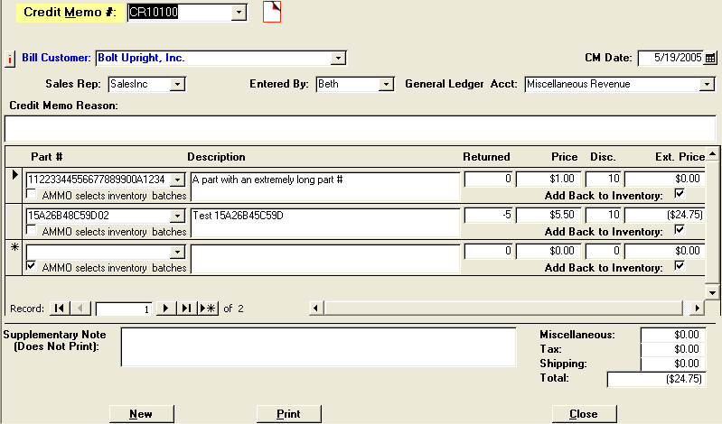 Credit Memo The Credit Memo screen allows you to credit customer accounts. You can enter information for the customer to see and private internal notes that are not printed on the credit memo. Access Manufacturing Management Overlay lets you choose the general ledger account to apply the credit against. The part information and price automatically fills in, however both can be changed as needed. You can add the parts back to inventory and select the assigned batches or deselect the box to add the part back to inventory at a later time.