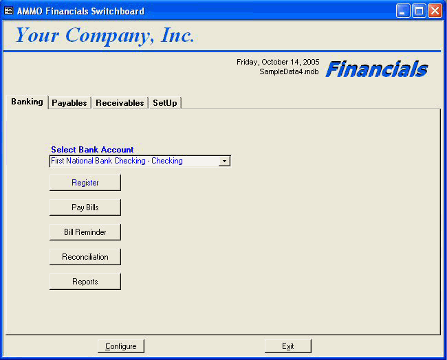 Financials Switchboard The financials switchboard is divided into four separate functions: Banking, Payables, Receivables, and SetUp. To view the switchboard for each category, click on the appropriate tab. When the financial module opens, it automatically starts in the Banking Switchboard. A.M.M.O. lets you choose which bank account you are working from by selecting the account from the drop down menu. Once you have selected the account, you can open the check register, perform account reconciliation, pay bills, or put repeating bills into your bill reminder. Various financial reports are also available from this screen.